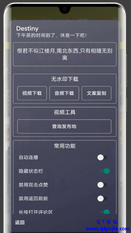 功能:防烧屏,全屏模式,自动播放,禁止点赞,全屏显文案,视频过滤,自定义顶栏标签等;